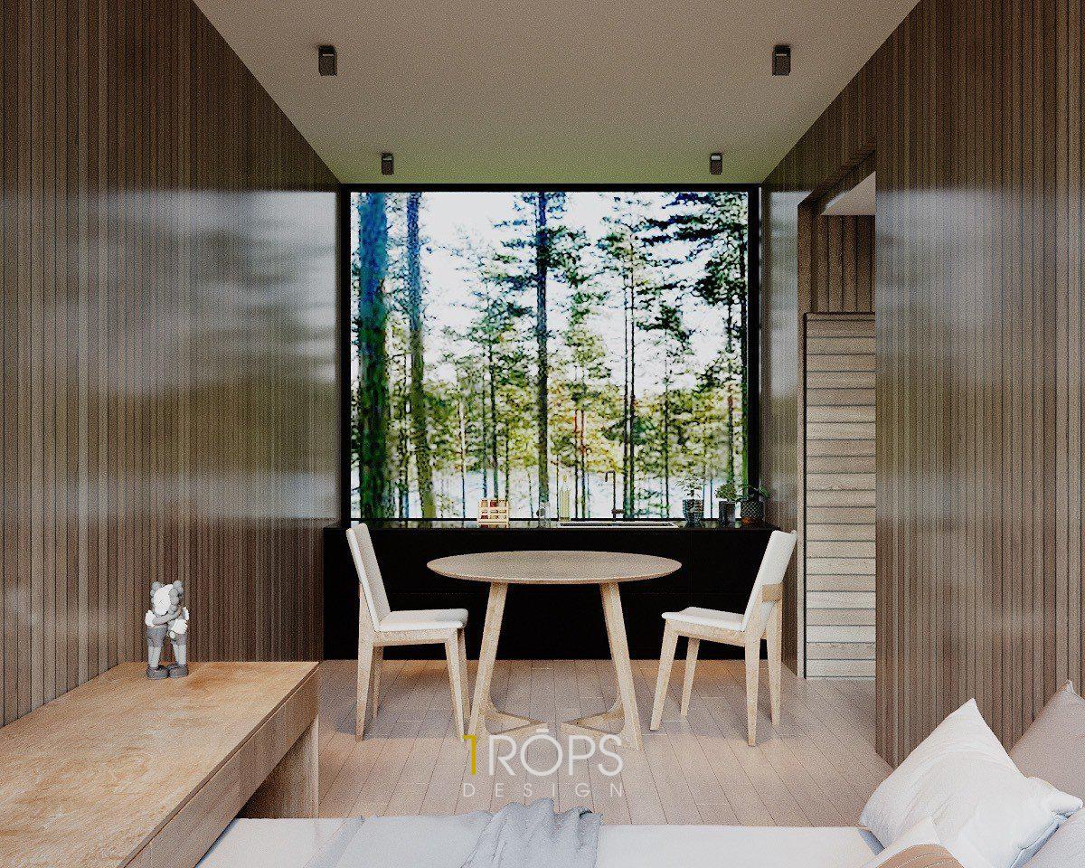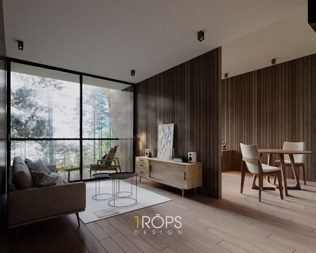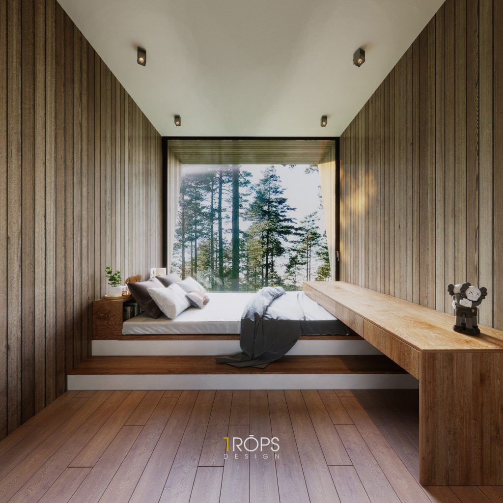 Vật liệu chính được sử dụng là gỗ và kính tạo cảm giác phóng khoáng và hòa nhập với thiên nhiên