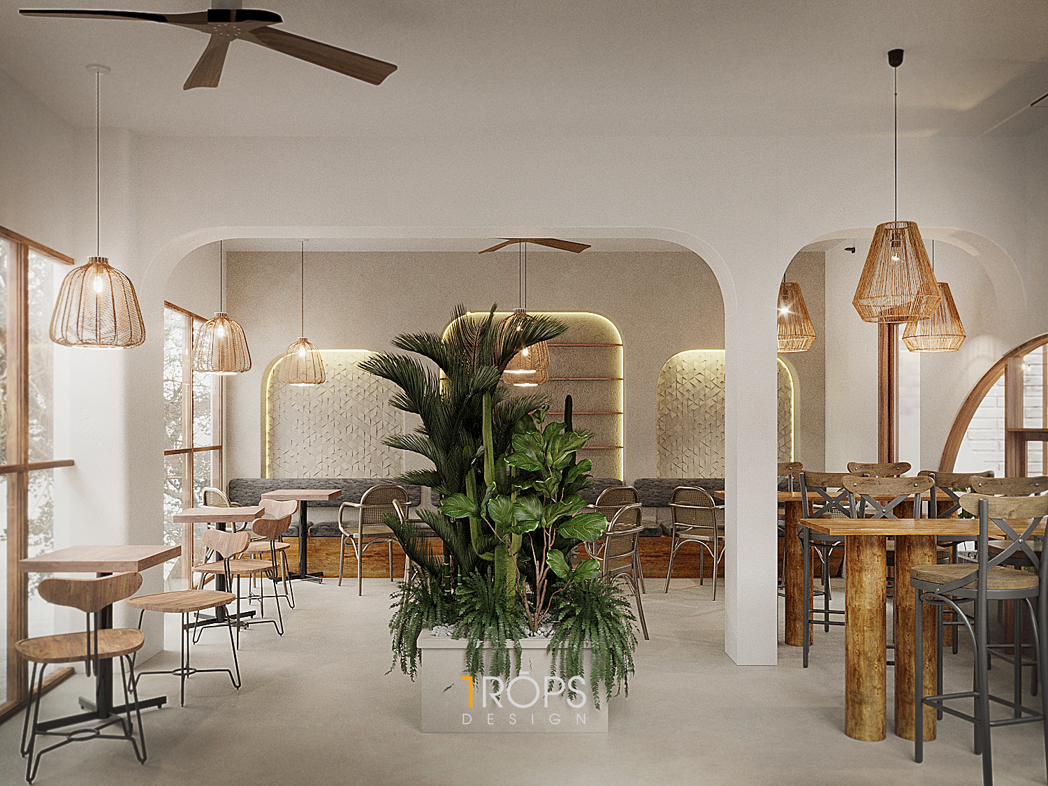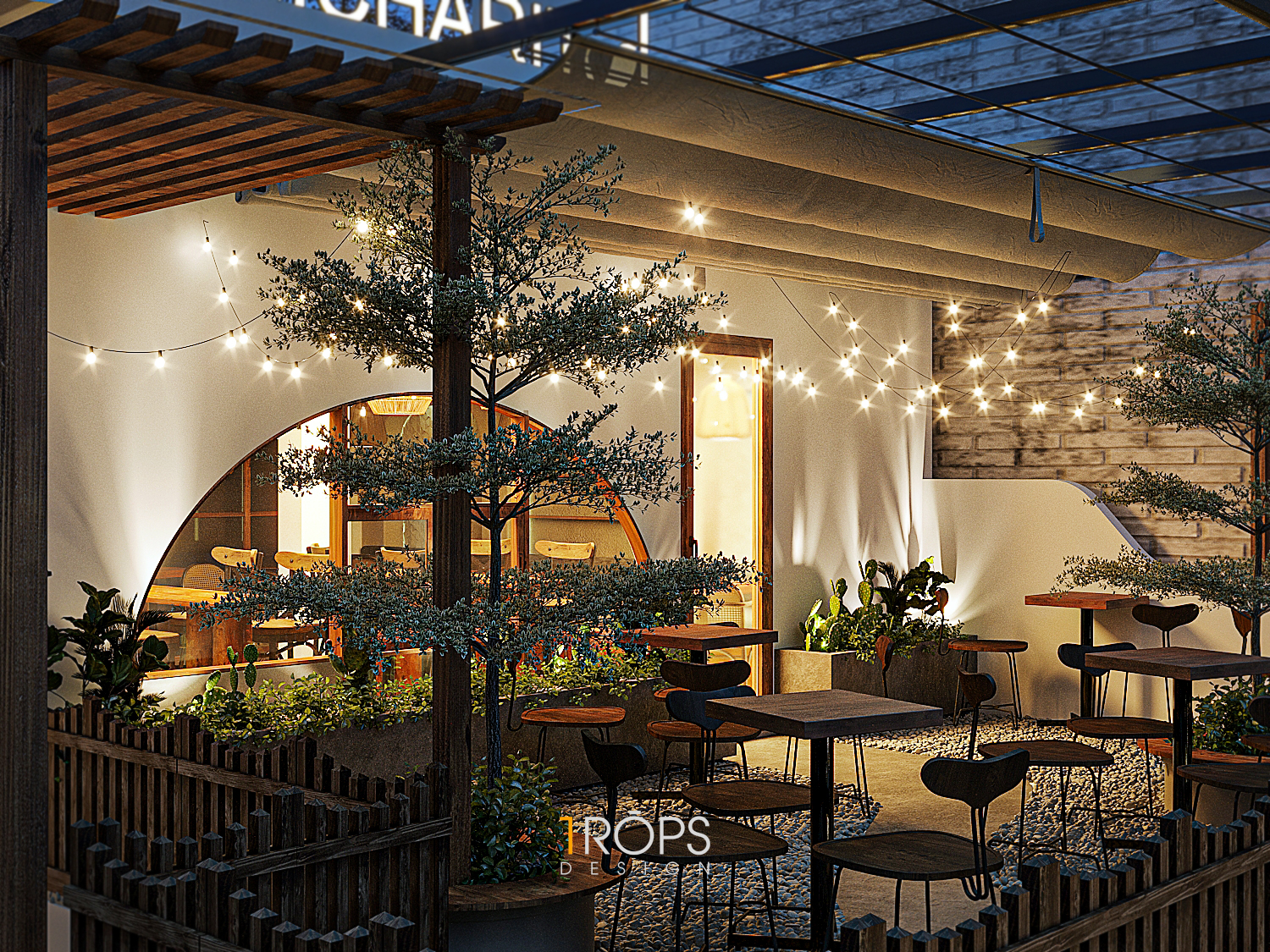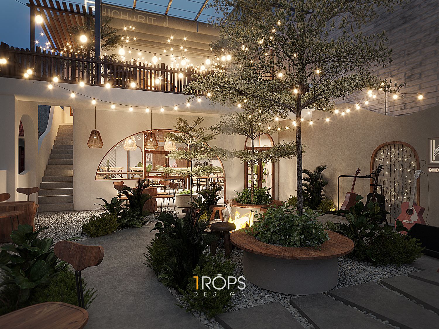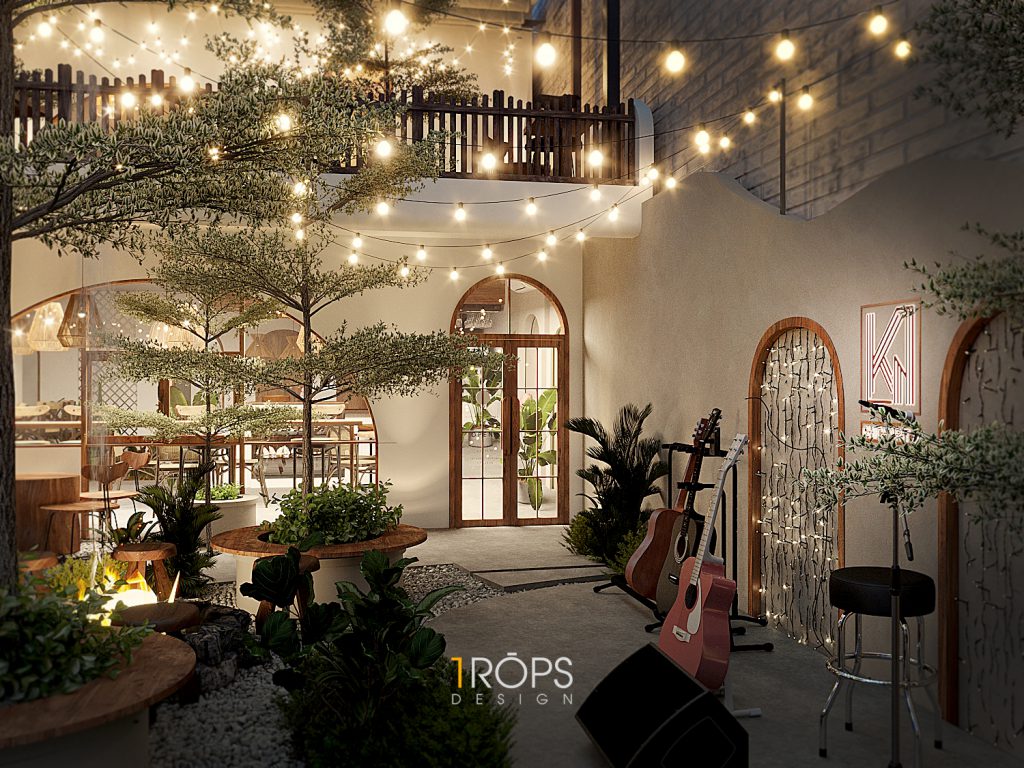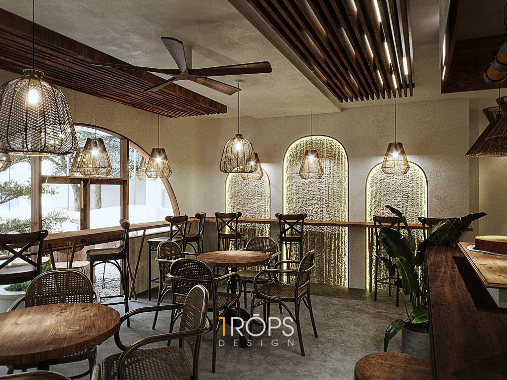 Tuy rằng diện tích của cả công trình không quá rộng, nhưng việc bố trí và phân chia không gian hợp lý vẫn đủ để tạo cảm giác thoáng đãng. Phối kết hợp vật liệu và ánh sáng tạo cho quán một vẻ cuốn hút dù cho là ban đêm hay ban ngày!