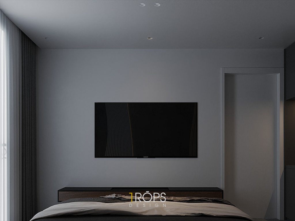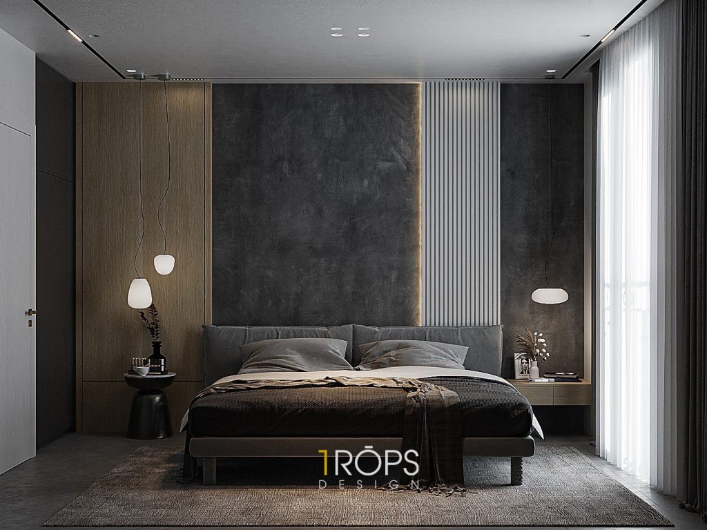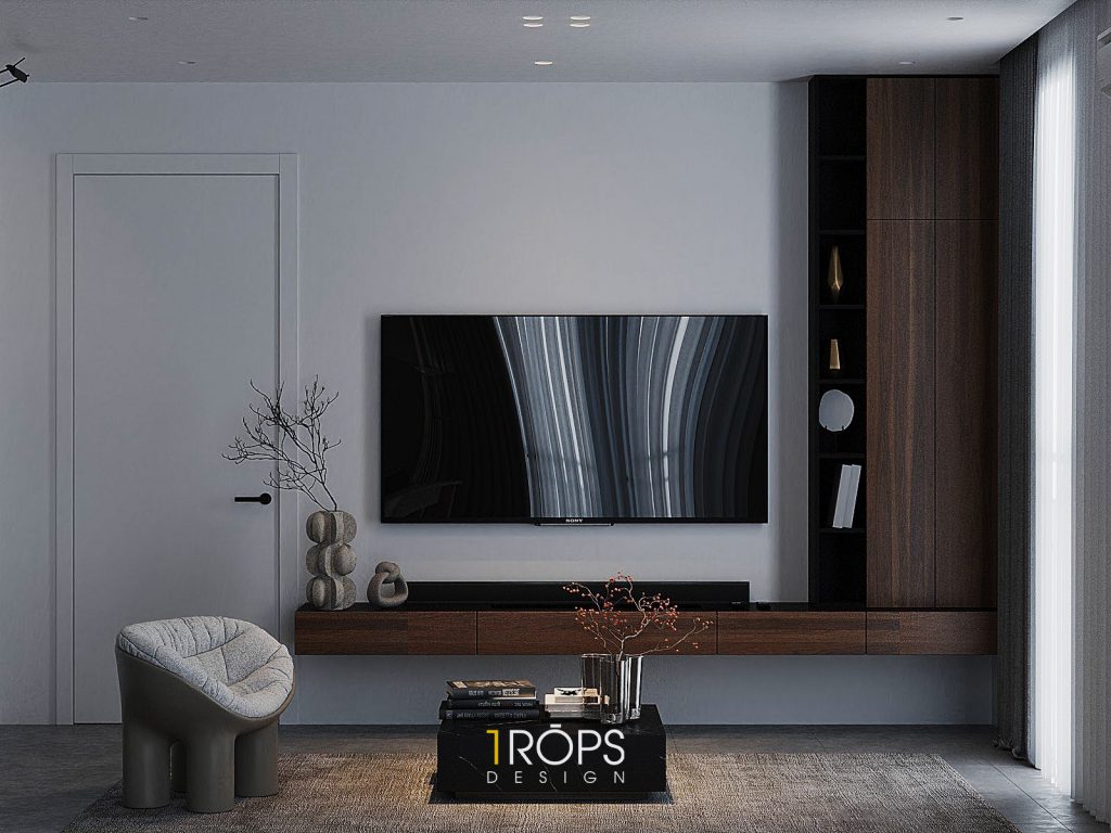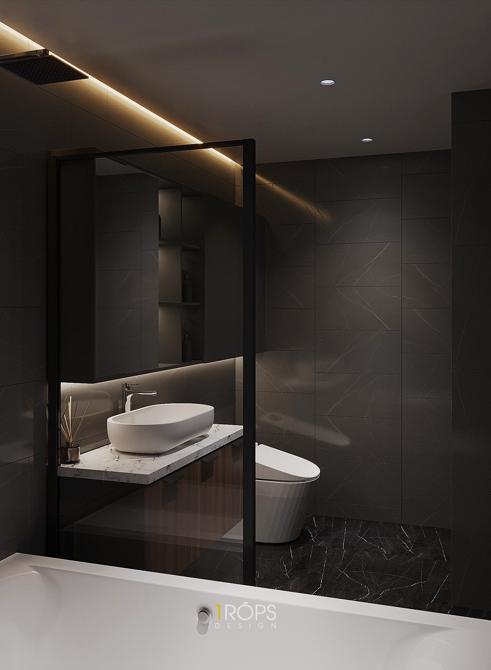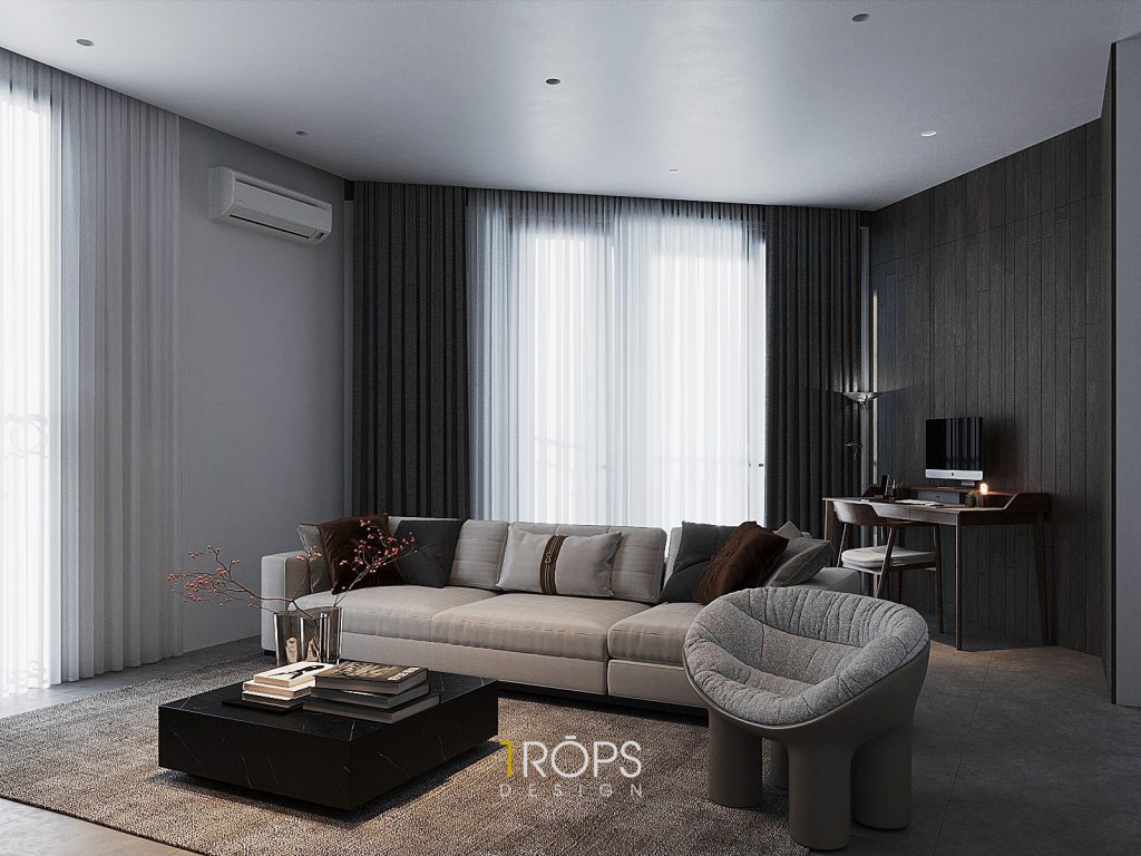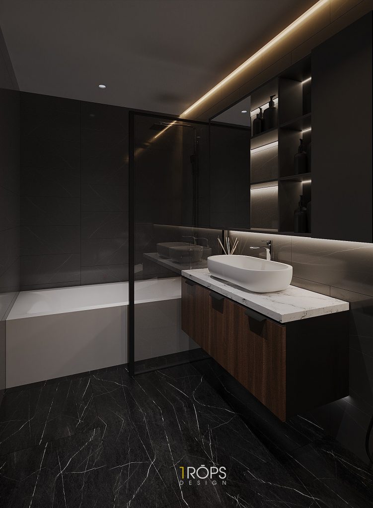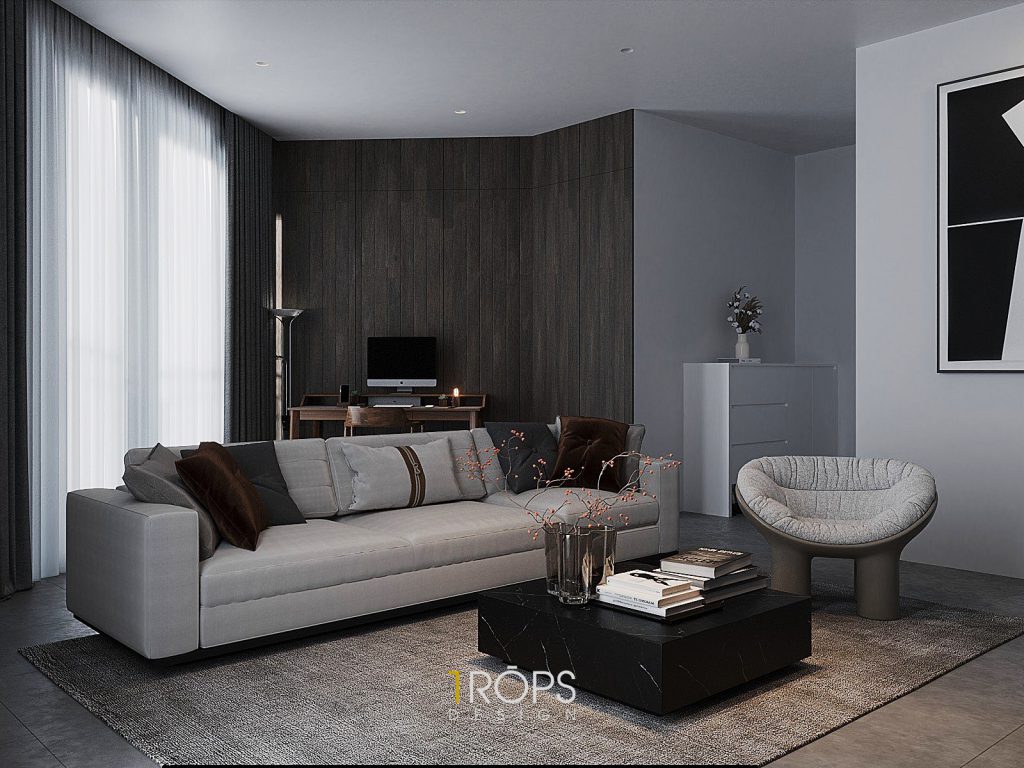Một công trình nội thất mang phong cách hiện đại, được sử dụng chủ yếu là tone màu đen và vàng