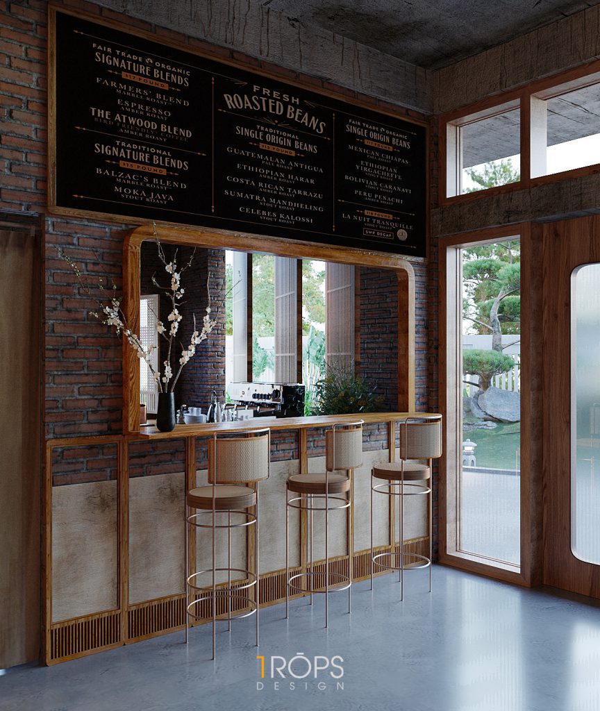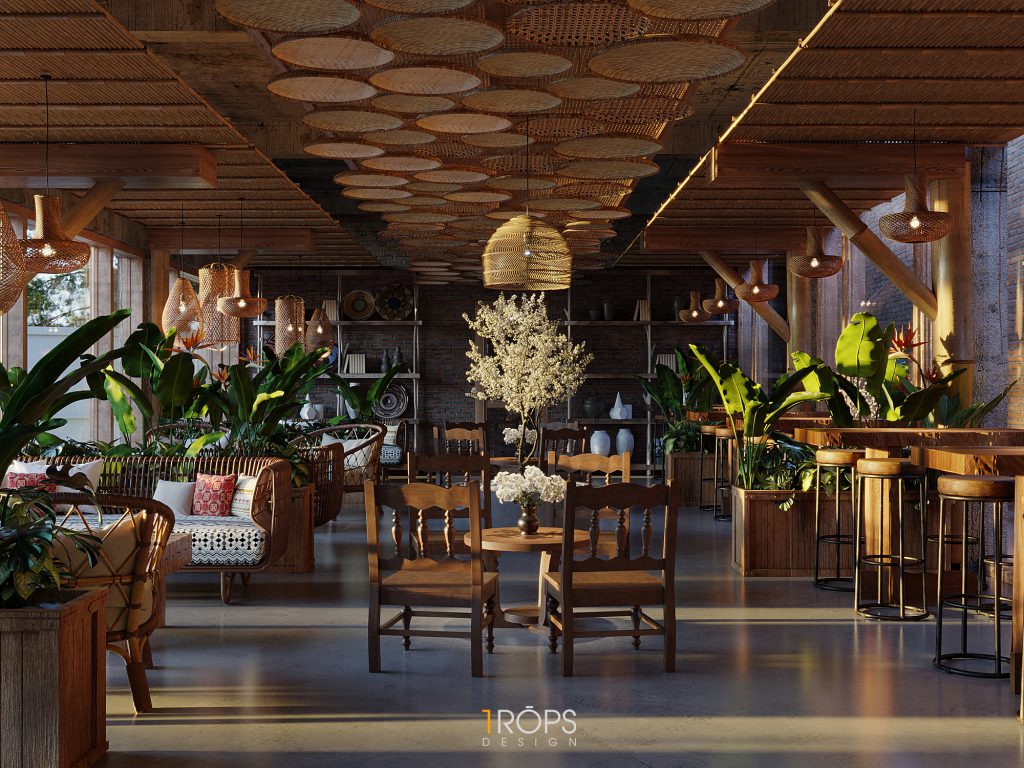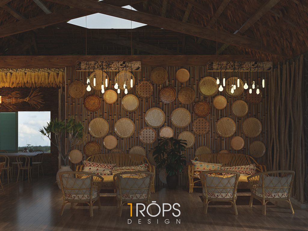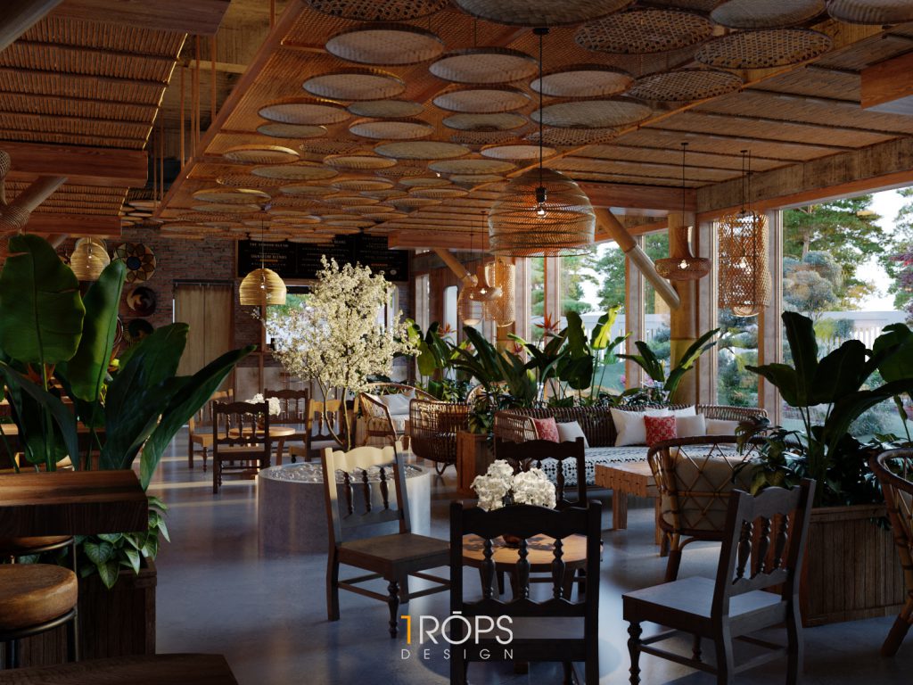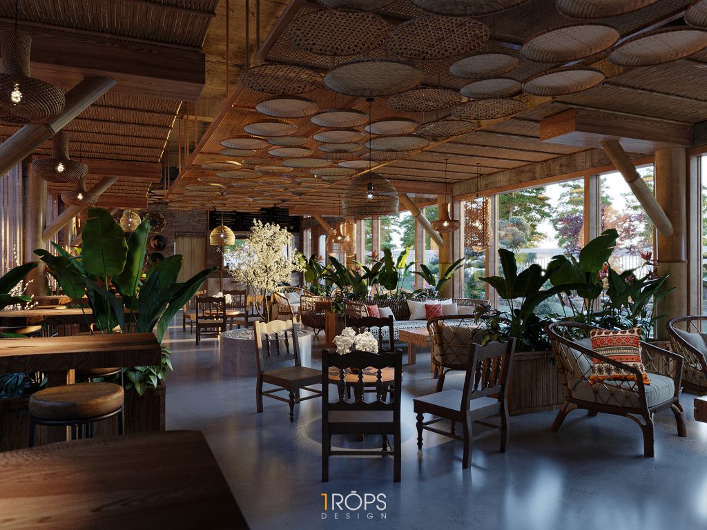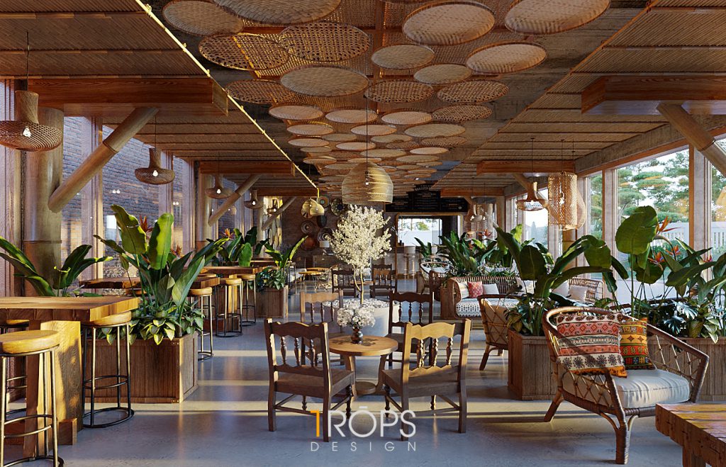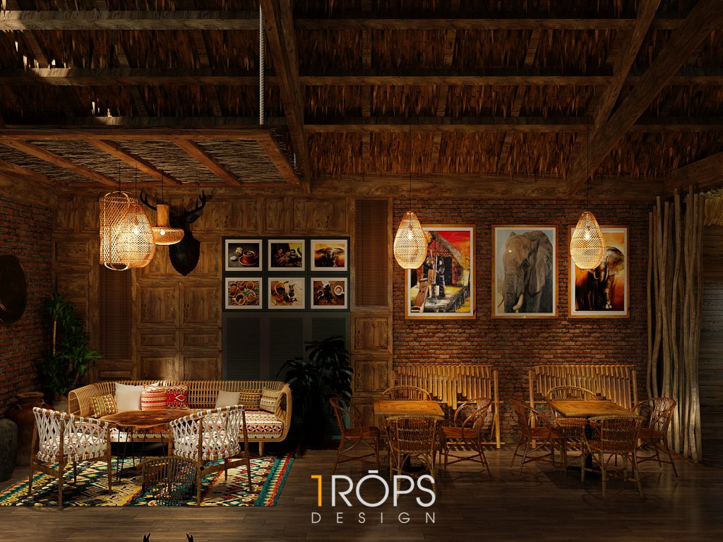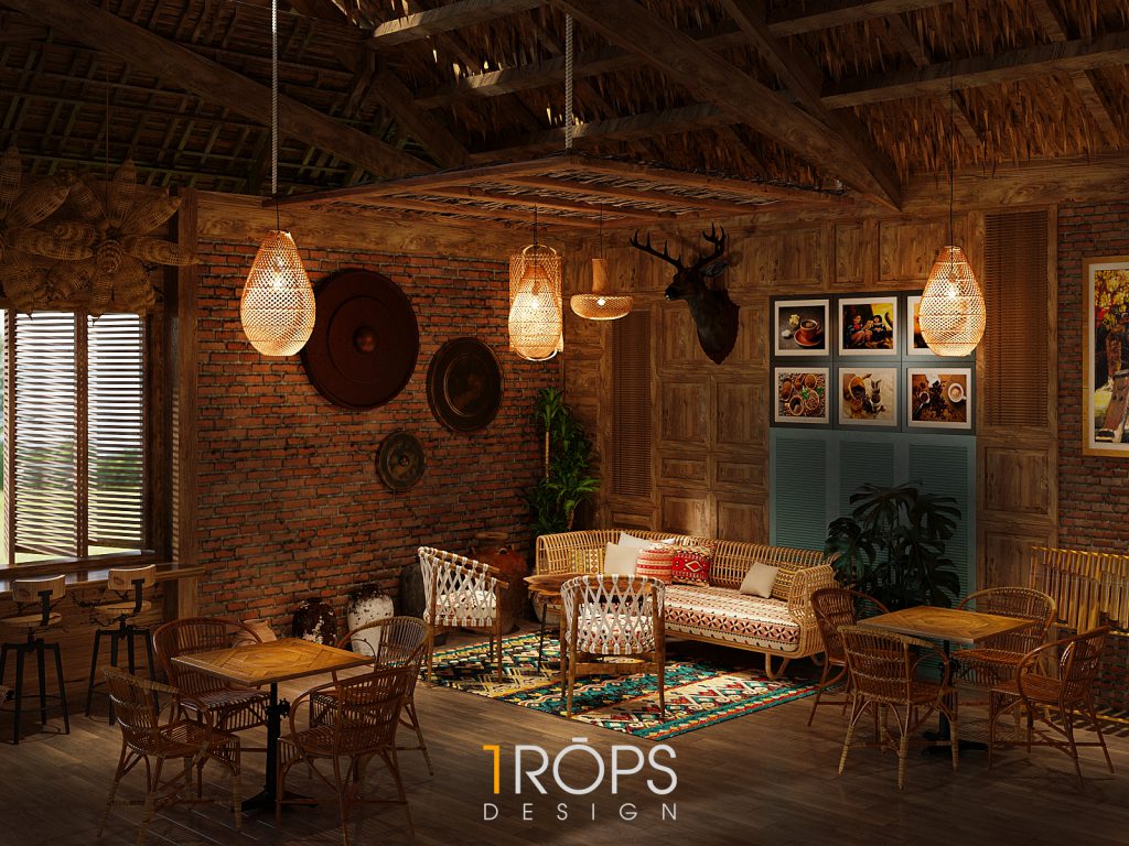 Công trình được Trops design thiết kế mang hơi thở của vùng Tây Bắc với những hình ảnh đặc trưng của đồng bào người H’Mông. Không gian được lồng ghép một cách tinh tế giống như trong một ngôi nhà của người dân tộc xưa, nhưng cũng không kém phần trẻ trung hiện đại. Chúng tôi đã mang những nét đặc sắc nhất, tinh tế nhất của văn hóa dân tộc như những họa tiết trang trí thổ cẩm, những đồ decor, đèn, vật liệu thô sơ, … vào trong thiết kế này. Kết hợp cùng ánh sáng vàng nhẹ nhàng, ấm cúng tạo cho người đến thưởng thức cafe giống như được sống cùng với những người dân tộc H’Mông ở mảnh đất xinh đẹp ấy. Mời mọi người cùng ngắm nhìn không gian tầng 1 của quán.