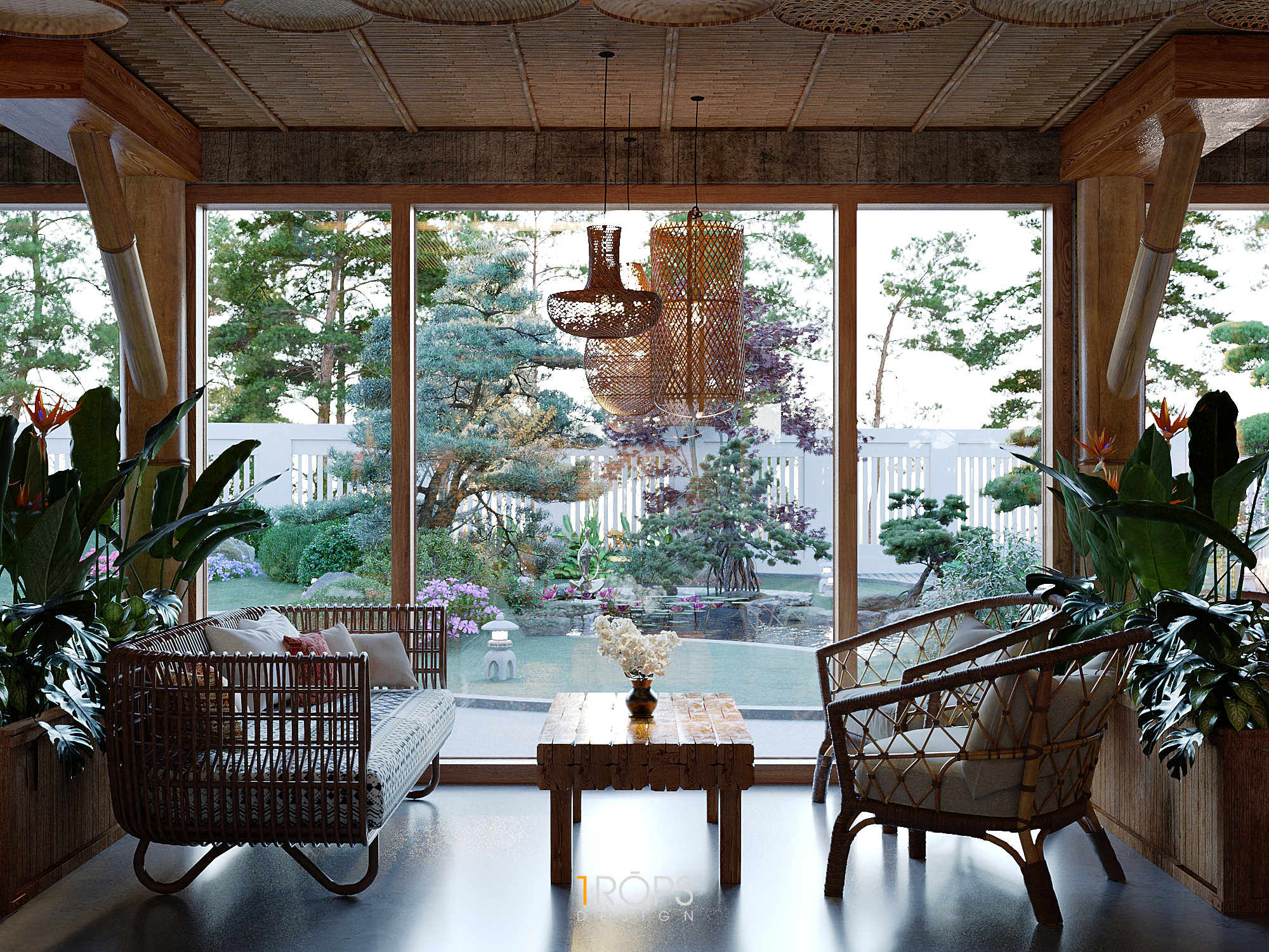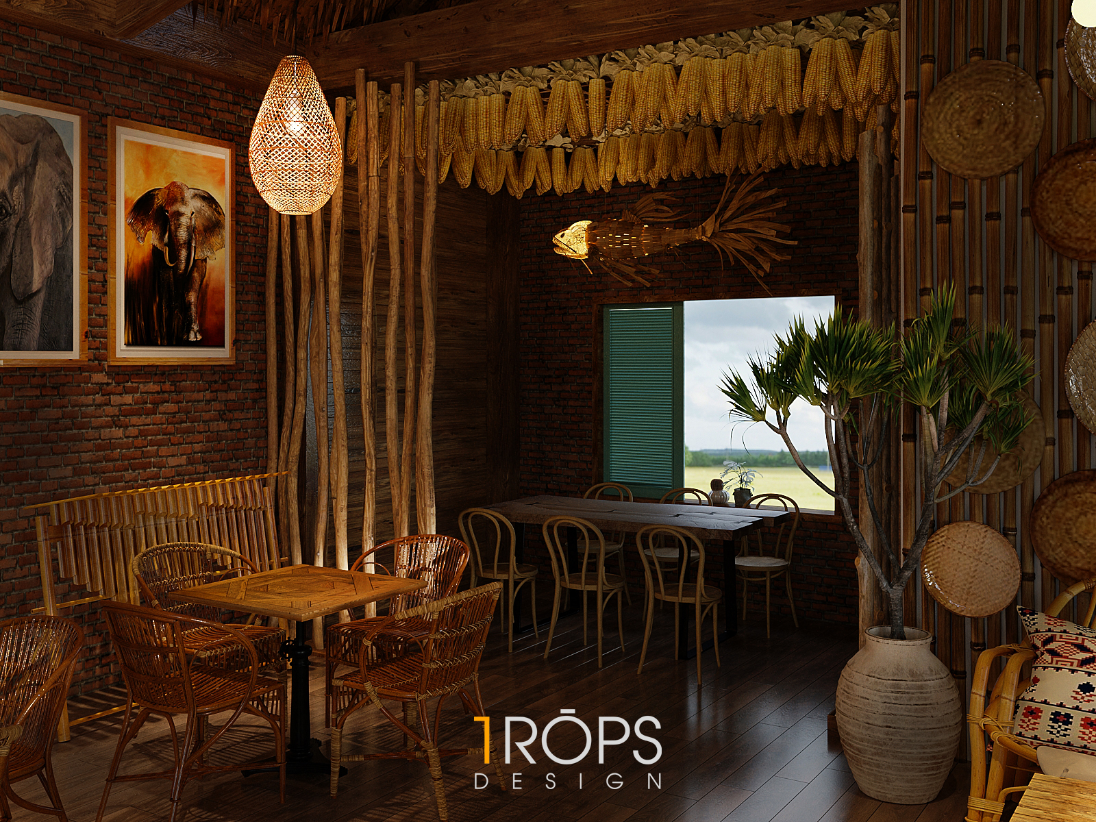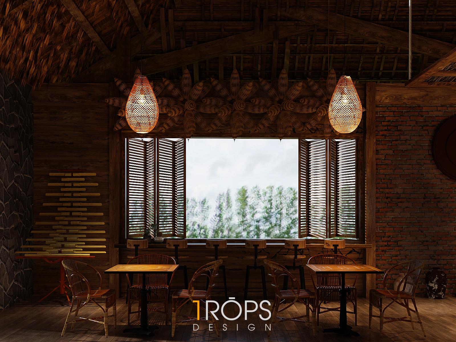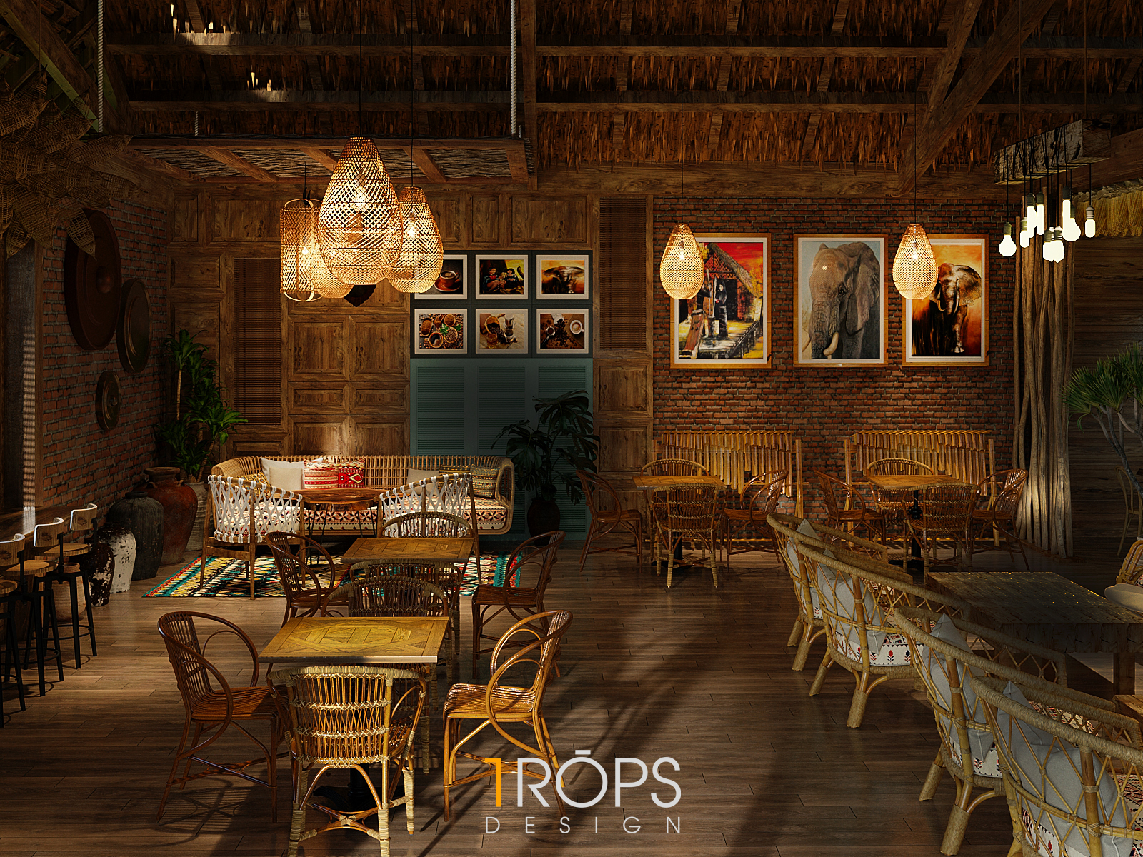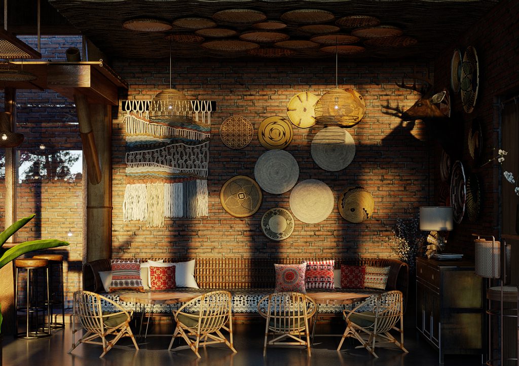 Công trình được Trops design thiết kế mang hơi thở của vùng Tây Bắc với những hình ảnh đặc trưng của đồng bào người H’Mông. Không gian được lồng ghép một cách tinh tế giống như trong một ngôi nhà của người dân tộc xưa, nhưng cũng không kém phần trẻ trung hiện đại. Chúng tôi đã mang những nét đặc sắc nhất, tinh tế nhất của văn hóa dân tộc như những họa tiết trang trí thổ cẩm, những đồ decor, đèn, vật liệu thô sơ, … vào trong thiết kế này. Kết hợp cùng ánh sáng vàng nhẹ nhàng, ấm cúng tạo cho người đến thưởng thức cafe giống như được sống cùng với những người dân tộc H’Mông ở mảnh đất xinh đẹp ấy. Mời mọi người cùng ngắm nhìn không gian tầng 1 của quán.
