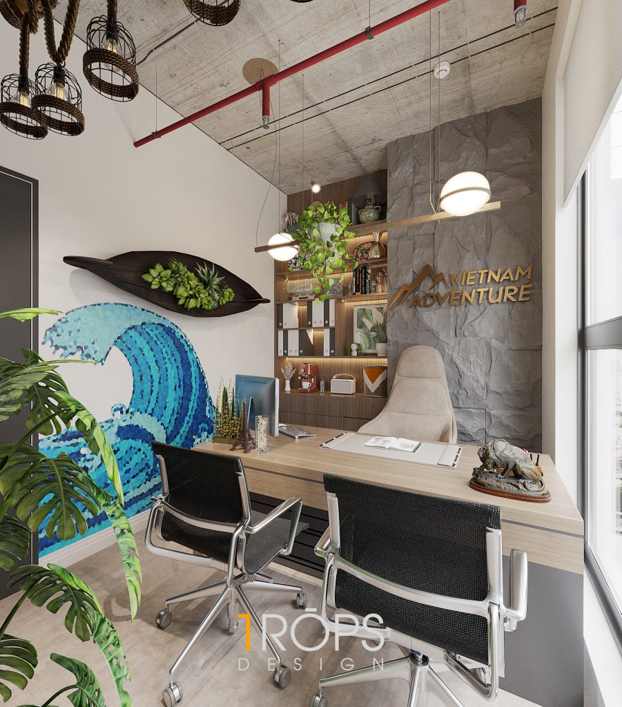 Phòng giám đốc được trang trí với họa tiết núi rừng và biển cả. Hình ảnh con sóng đưa chiếc thuyền đi xa với ý nghĩa đưa công ty ngày càng vươn xa ra biển lớn.